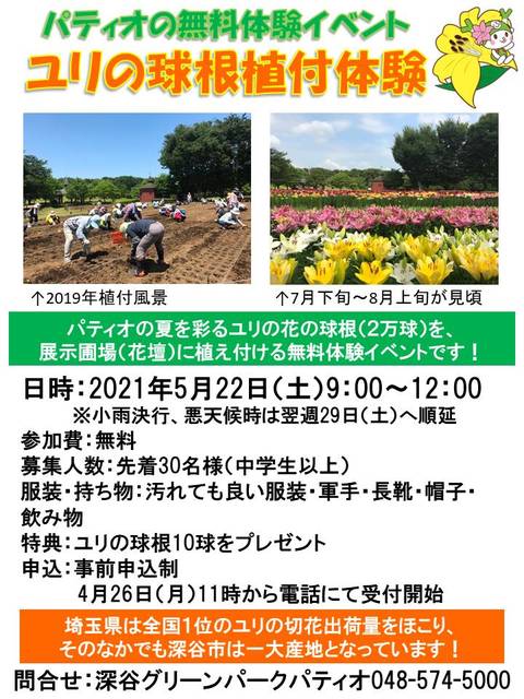パティオの無料体験イベント 埼玉県は全国1位のユリの切花出荷量をほこり、その中でも深谷市は一大産地となっています。 ユ…