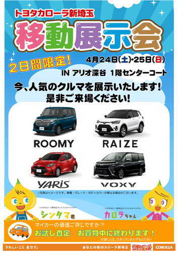 2日間限定! ”トヨタカローラ新埼玉 移動展示会” 今、人気のクルマを展示いたします! 是非ご来場ください!