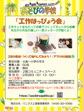 ★あそびの学校★ 工作はっぴょう会 工作キットをもらってお家でつくってネットから応募! 先生から作品の嬉しい一言メッ…