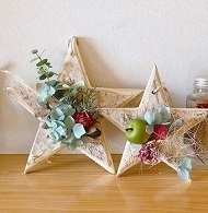 白樺製の星形ベースの上にドライフラワーをアレンジしていく内容の教室です。完成すると壁掛けになります。 先着10人