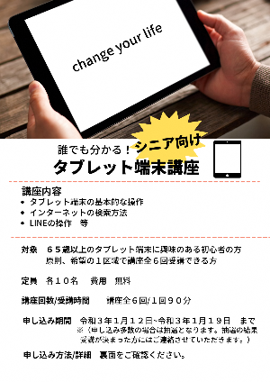 本講座では、日常生活を豊かにするためのタブレット端末の基本的な操作、インターネット検索、LINEの操作等を楽しく学ぶこ…