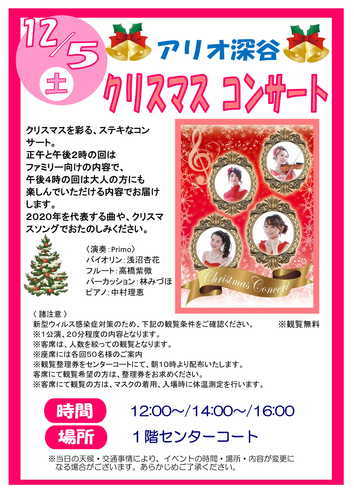 クリスマスを彩る、ステキなコンサート。 正午と午後2時の回はファミリー向けの内容で、 午後4時の回は大人の方にも楽しん…