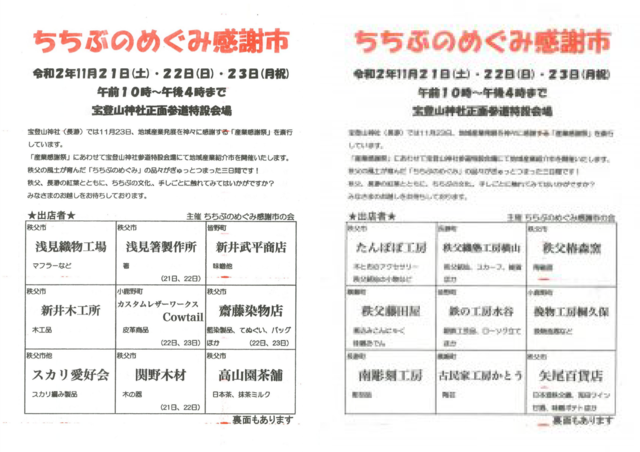 宝登山神社では、11月23日の「産業感謝祭」に合わせ、 秩父地域の地域産業紹介市『ちちぶのめぐみ感謝市』を開催いたしま…