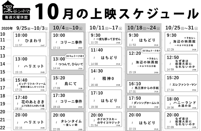深谷シネマ 10月の上映スケジュール 【お知らせ】 ■深谷シネマでは新型コロナウイルスをはじめとする感染症予防のため…