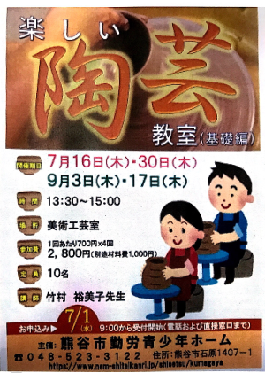 楽しい陶芸教室(基礎編) ※全4回 日程:7/16、7/30、9/3、9/17 ※全4回 時間:13:30~15:0…