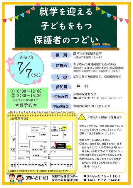 令和3・4年度に就学を迎えるお子さんの発育・発達などに心配のある保護者が対象です。 ※要予約 ▼日時 令和2年7月7…