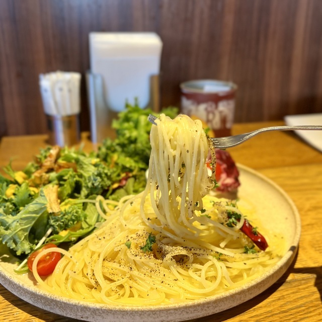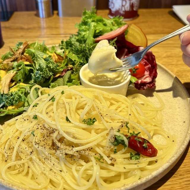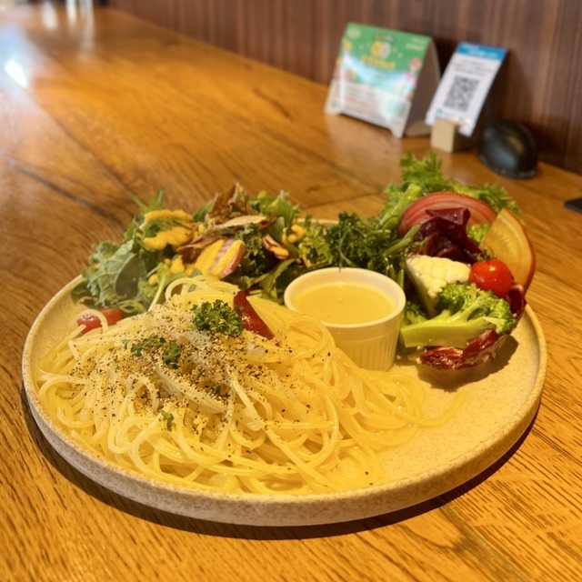 パスタプレート(1380円)は、サラダ・バーニャカウダ・パスタがワンプレートになっていて、野菜がたっぷり! ケールやおかひじきなど珍しい野菜も入っていて新鮮でした。 特にバーニャカウダソースは濃厚で絶品。 ピリ辛のペペロンチーノも食べ進めるうちにクセになる美味しさでした。 店内は落ち着いた雰囲気で、おひとりランチにもぴったり。野菜をしっかり食べたいときにおすすめのお店です。