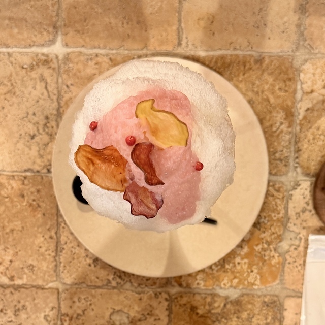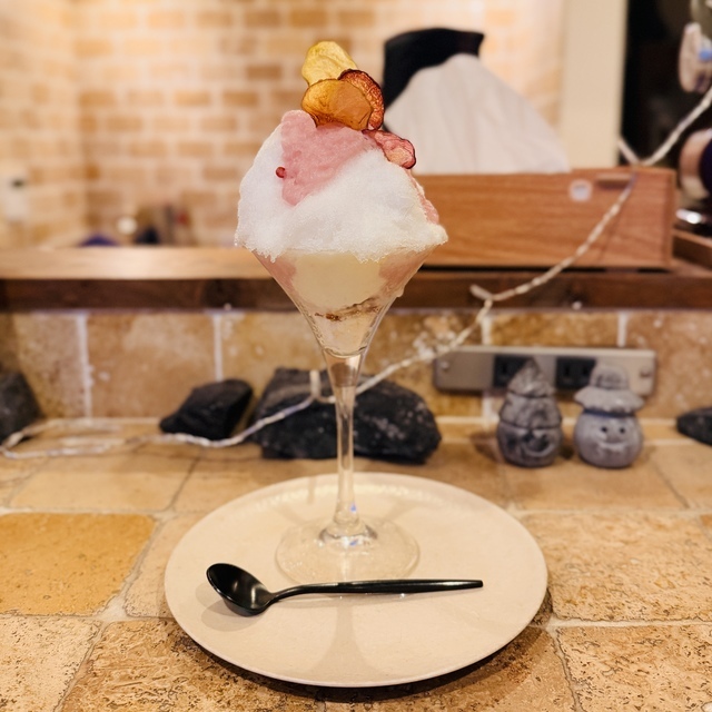 毎月通っている、本庄市の大好きなかき氷店「S°(エスド)」さん。 今回は夕暮れ時の幻想的な雰囲気の中、2月限定の「Potato Valentine」をいただきました。 カクテルグラスに盛られた美しい氷の中には、なんと「ニシュタカ」のマッシュポテトが! レッドドラゴンのエスプーマの甘みと、ローズマリー香るお芋の塩味が絶妙な「甘じょっぱさ」を生み出していて、最後の一口まで感動の連続でした。 (投稿:2026/02/24   掲載:2026/02/26)