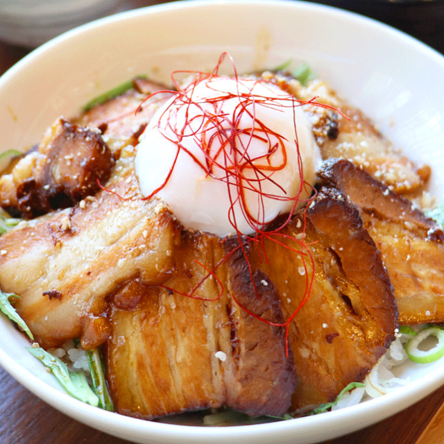 トロトロのチャーシューがご飯上にドドン!中央にぷるんぷるんの温玉を乗せた贅沢丼ぶり。特製ダレの香ばしい香りが食欲を誘います。