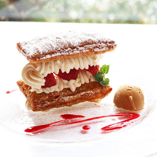 美しく飾り付けられた皿に、高く組み立てられた<苺のミルフィユ>。コース料理に組み込まれたものとは思えぬ豪華さに、お皿を前にして思わず「凄い!こんなに豪勢でいいんですか?!」と口にしてしまった程。お客様の来店時間に合わせて分単位にスケジューリングされ、2日かけて丁寧に仕上げる一品です。