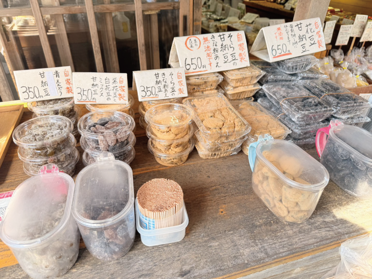 りりりんごりら さん (女性/深谷市/40代/Lv.40)長瀞駅から岩畳に続く商店街の中にあります。 店内には煮豆、甘納豆、薬草茶などなど狭いながらも品揃え豊富で見応えがあり楽しいお店です。 店先には試食もありました。 煮豆は朝炊いたお豆が店頭に並ぶとの張り紙あり。 花豆の煮豆、ミニサイズを購入したのですが自宅で食べ試食より更に美味しく感じ、大きいサイズで購入しなかったのを後悔するほど(笑) また、店内で販売されているお茶がポットにあり、紙コップも用意されていて一腹させていただきました。 乾豆は大粒で立派なのにお手頃な価格。 煮豆や甘納豆はミニサイズカップと多めタイプとあり、心配りが嬉しいです。 店員さんの声掛けも良心的であたたかいお店でした。 長瀞にきたら必ず立ち寄りたい。と思うステキなお店でした。 (投稿:2021/02/28 掲載:2021/03/01)